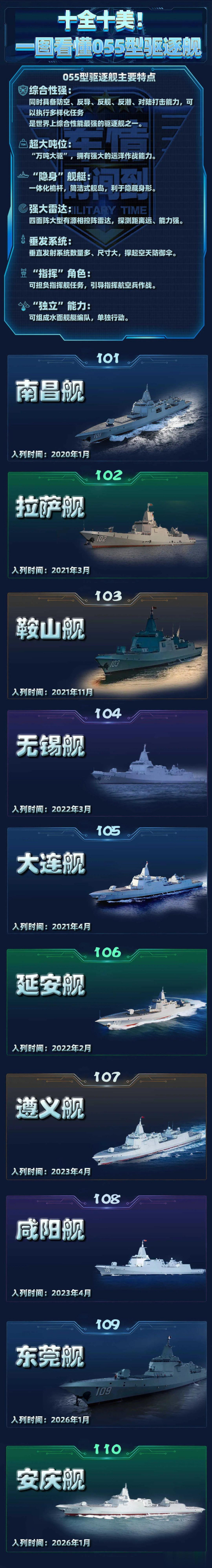 从2020年1月首舰南昌舰入列到当今,6年时辰,10艘055型散伙舰,一起列装完了。