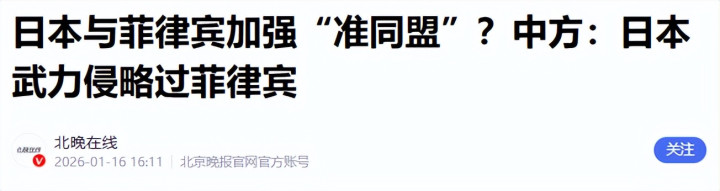2.《日本与菲律宾加强“准同盟”?中方:日本武力扰乱过菲律宾》2026-01-16 16:11 | 源流:北京晚报