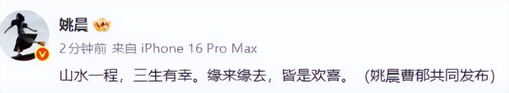 她在声明中写谈三生有幸,缘来缘去都是欢娱,这条是她和前夫曹郁共同的案牍。